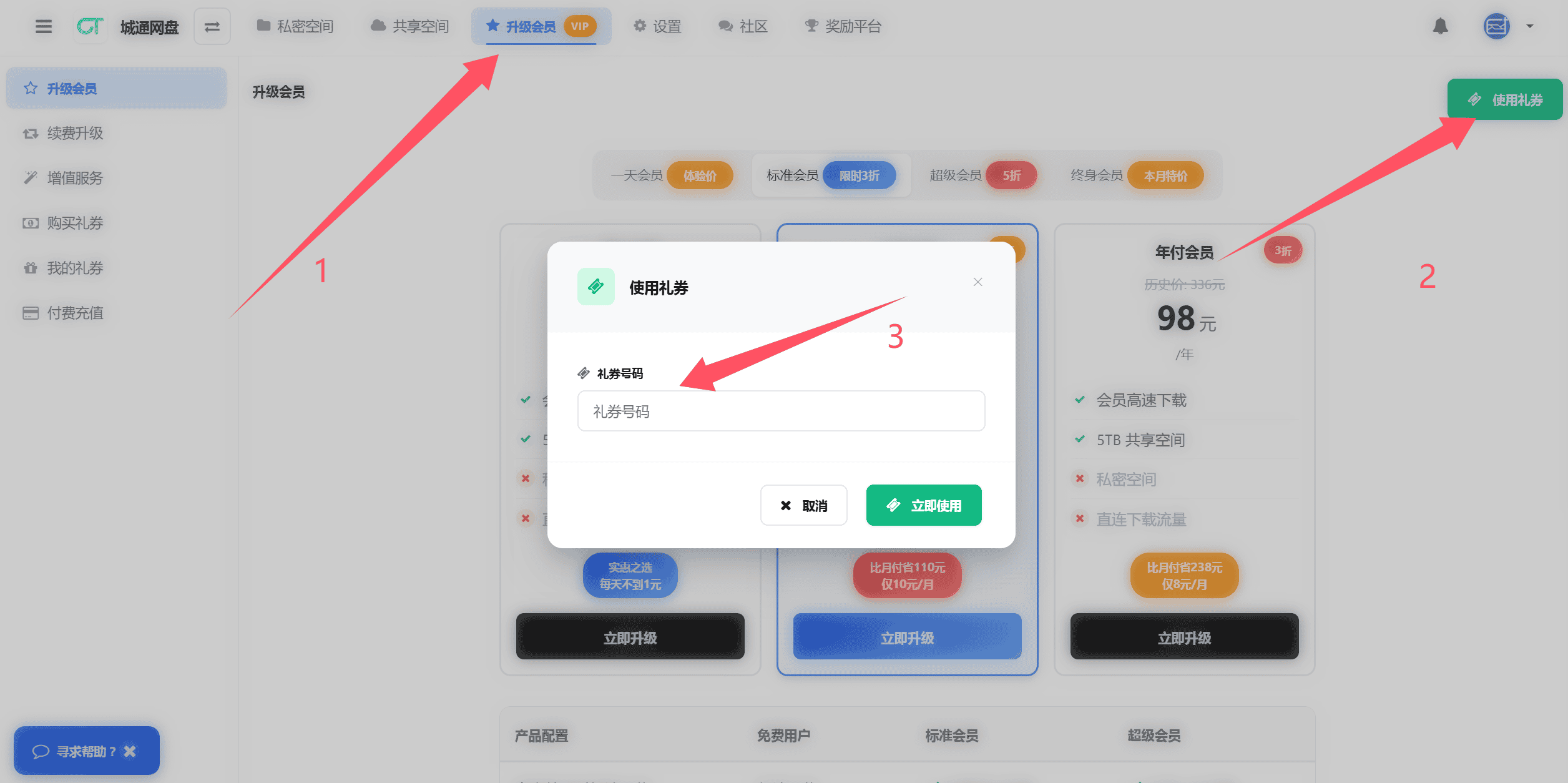 登录 诚通网盘官网,然后点击 升级会员,在左边点击我的礼券,右边使用礼券输入购买的礼券号码既可。